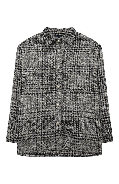 Клетчатая темно-синяя рубашка с длинными рукавами сможет заменить легкую куртку или жакет в прохладный день. Для пошива модели с отложным воротником и накладными нагрудными карманами вместо привычной тонкой ткани мастера марки использовали фактурный мягкий твид. Изделие застегивается миниатюрными перламутровыми пуговицами, стилизованными под жемчужины.