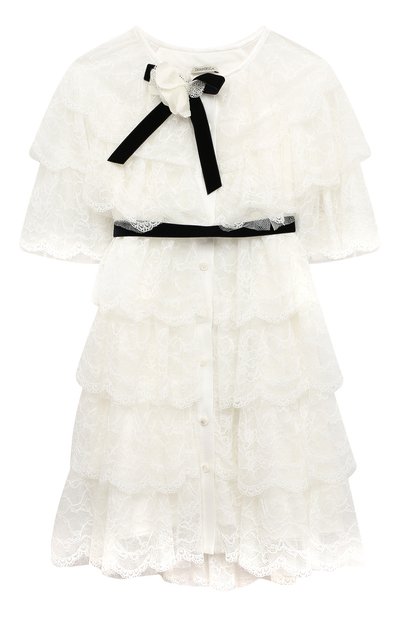 Для пошива белого платья с многоярусным подолом мастера марки использовали тонкое нежное кружево с цветочным мотивом. Широкий воротник стилизовали под пелерину. Роль контрастных акцентов поручили черным поясу и банту, которым подчеркнули круглый вырез.