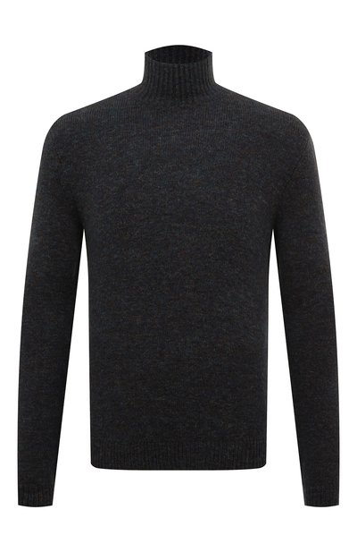 Сине-серый меланжевый свитер с высоким эластичным воротом, как у водолазки, связали из мягк ой фактурной пряжи. В ней соединили тончайшую шерсть, мохер и шелковистую вискозу, а усилили материал нитями акрила и нейлона, поэтому модель не вытягивается со временем. Предлагаем носить такую вещь с брюками, челси и бомбером.