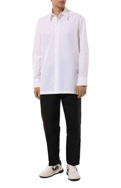 Для изготовления белых кедов New Roma с перфорацией на мысе и боковых панелях мастера марки использовали гладкую мягкую наппу. Доменико Дольче и Стефано Габбана добавили паре графичность, подчеркнув края деталей узким черным кантом. Двухцветную подошву декорировали на заднике контрастным логотипом, язычок – текстильным патчем с жаккардовой DG-монограммой.