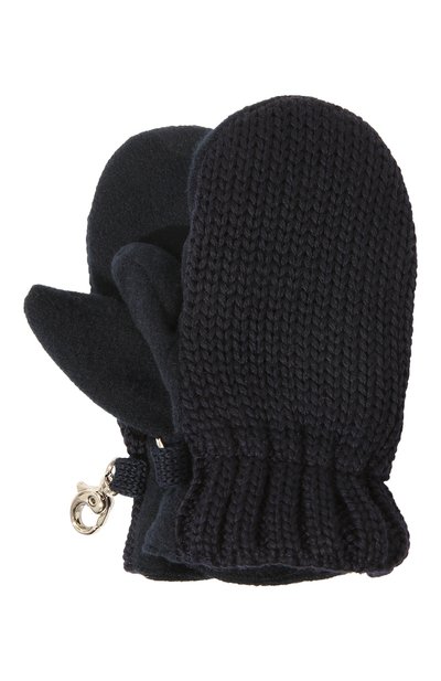В темно-синих варежках будет комфортно во время прогулки в холодную погоду. Для изготовления модели мастера марки использовали мягкую теплую шерсть, а для отделки – нежный флис, который защищает от ветра и быстро сохнет после игры в снежки. Чтобы снег не попал внутрь, манжету дополнили эластичной вставкой.