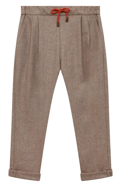 Для пошива коричневых брюк с шевронным жаккардовым узором мастера марки использовали очень мягкую тонкую шерсть. Она хорошо сохраняет тепло, не перегревая при этом, и не колется, поэтому в изделии будет комфортно весь день. Модель с защипами на талии, делающими посадку свободнее, дополнили регу лируемой кулиской на поясе.