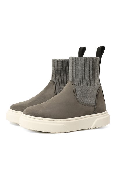 Дизайнеры марки дополнили серые слипоны из мягкой бархатистой кожи высокой эластичной вставкой, имитирующей носок. Хлопковая деталь плотно, но комфортно облегает ногу. Чтобы модель без застежки было удобнее надевать, на вырезе предусмотрели петлю.