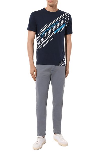 Дизайнеры марки, основанной Стефано Риччи, представили комфортную версию футболки цвета ночного неба. Для пошива прямой модели выбрали тонкое джерси, в котором тонкие нити мерсеризованного хлопка соединили с нежнейшим модалом. Приятные на ощупь волокна из древесины эвкалипта препятствуют появлению посторонних запахов.