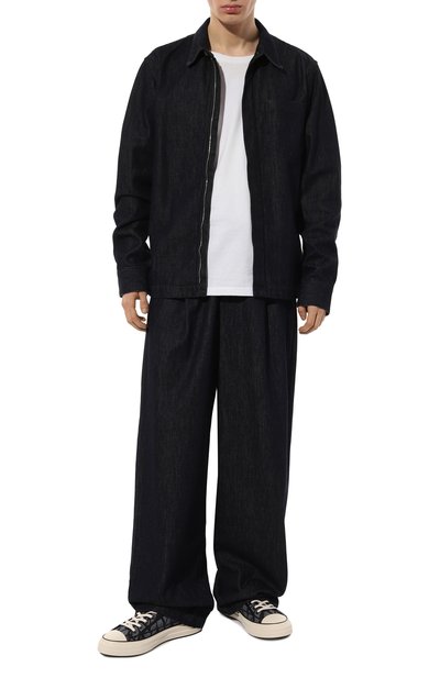 Дизайнеры марки, основанной Мартином Маржелой, расширили линию обуви Tabi кедами черного цвета. Для пошива пары с характерным раздвоенным мысом выбрали прочную матовую ткань с плотным переплетением нитей. Цветовые акценты расставили белыми швами, шнуровкой и подошвой.