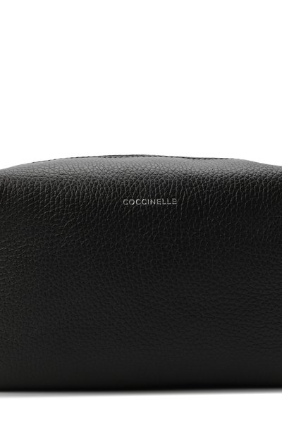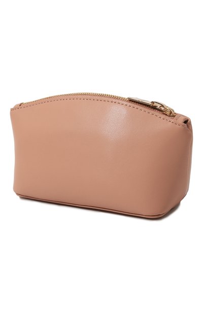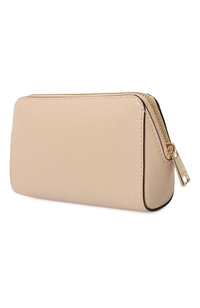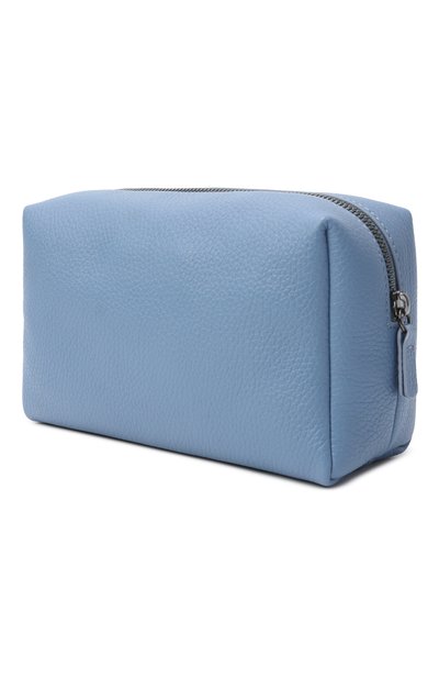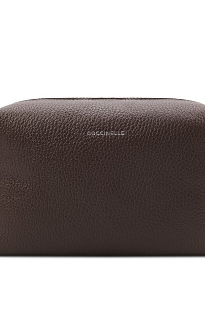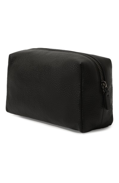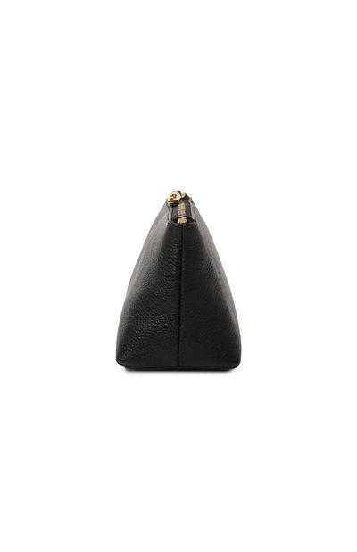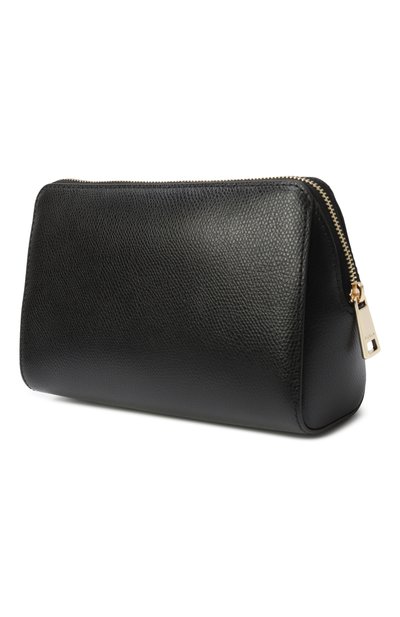 Прямоугольную косметичку с одним отделением сшили из зернистой матовой кожи. Спереди аксессуар на молнии украсили тисненым логотипом бренда.