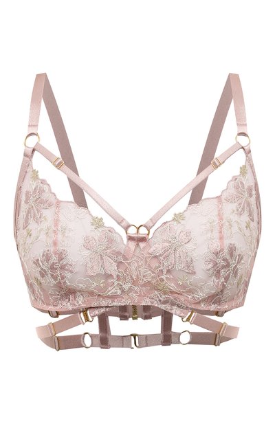 Для изготовления розового бюстгальтера с эффектом запаха и мягкими треугольными чашечками на косточках дизайнеры марки выбрали полупрозрачный швейцарский тюль. На нем искусно вышили цветочный мотив, который светится в темноте. Для многослойного пояса и бретелей использовали узкие атласные ленты, регулируемые слайдерами с 24-каратной позолотой.