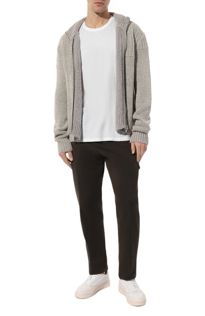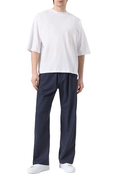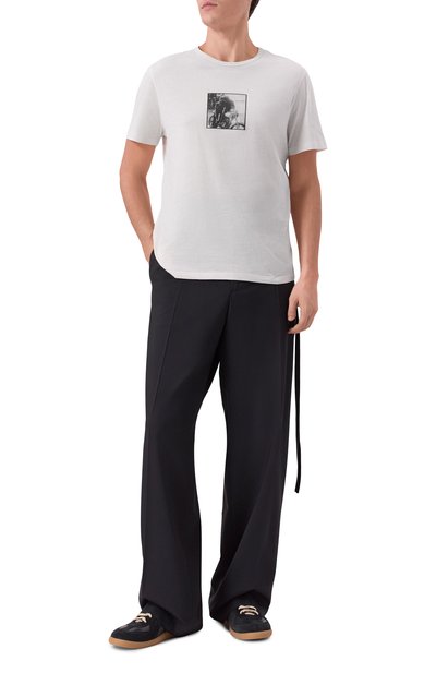 Прямую кремовую футболку с короткими рукавами сшили из тонкого дышащего джерси, которое почти не ощущается на теле. Для производства трикотажа использовали органический хлопок: его вырастили без применения химикатов, поэтому волокна материала мягче, прочнее и эластичнее обычного. Снизу модель украсили крупным текстильным патчем с логотипом марки, основанной Джил Сандер. В комплекте – три одинаковых изделия.