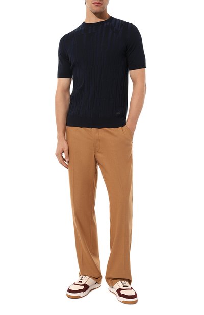 Джемпер с фактурным узором спереди связали из мягкой пряжи на основе хлопка и шелка. Рукава подчеркнули узким контрастным кантом.