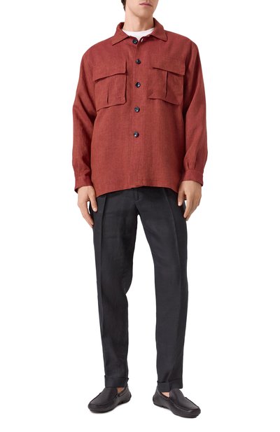 Для пошива прямой бордовой рубашки с отложным воротником мастера марки использовали тонкий легкий лен, обработанный для мягкости и деликатного блеска. Материал особенно хорошо пропускает воздух, быстро отводит влагу, поддерживая на коже ощущение приятной прохлады. Его пористые лубяные волокна неравномерно впитывают пигмент, поэтому после окрашивания ткань приобрела характерный неоднородный оттенок.