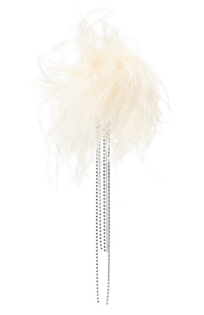 Утрированно длинная моносерьга, ниспадающая ниже плеча, автоматически сделает наряднее даже самый лаконичный образ. Модель с каскадной подвеской из сверкающих кристаллов украсили тонкими страусовыми перьями, чутко откликающимися на каждое движение. Для изготовления аксессуара использовали ювелирный сплав с покрытием из золота и серебра.