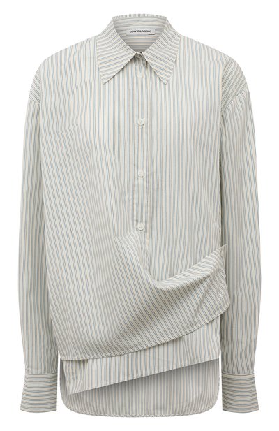 Полосатая рубашка с длинными рукавами выглядит расслабленнее классических моделей. За это отвечают свободный силуэт и асимметричная планка с пуговицами, создающая объемную драпировку спереди. Модель выполнили из тонкого прочного хлопка, который хорошо пропускает воздух и почти не ощущается на теле.
