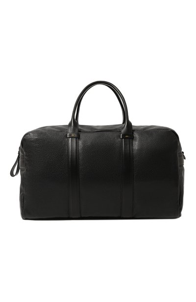 Мастера марки сшили черную дорожную сумку из мягкой плотной кожи с крупнозернистой фактурой, которая не боится случайных потертостей или царапин. Такой же материал, но с более гладкой поверхностью, использовали для отделки. Закрывающуюся молнией модель с двумя короткими ручками дополнили съемным плечевым ремнем, регулируемым по длине.