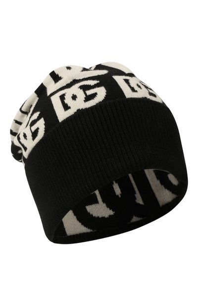 Черно-белую шапку выполнили из мягкой легкой пряжи с крупным повторяющимся узором в виде логотипа бренда. Нежный легкий кашемир в составе материала объединили с прочным полиамидом и тонким эластаном, поэтому аксессуар комфортно облегает голову и не растягивается со временем.