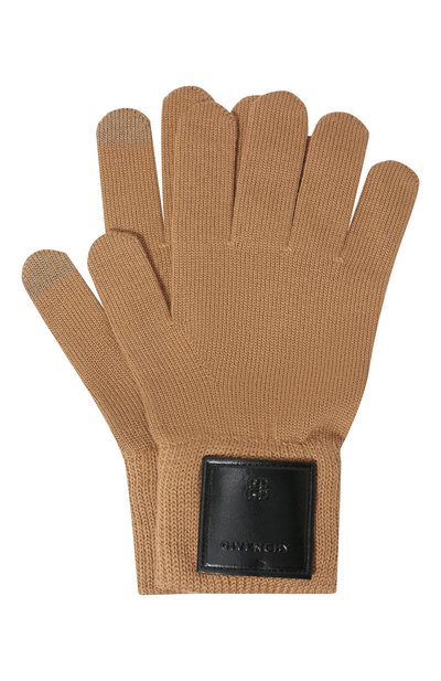 Для изготовления бежевых перчаток использовали тонкую мягкую шерсть. Модель, связанная простым гладким узором, хорошо сохраняет тепло, не сковывает движения рук и не натирает. Принадлежность аксессуара бренду обозначили, украсив широкую манжету кожаным патчем с эмблемой и логотипом.