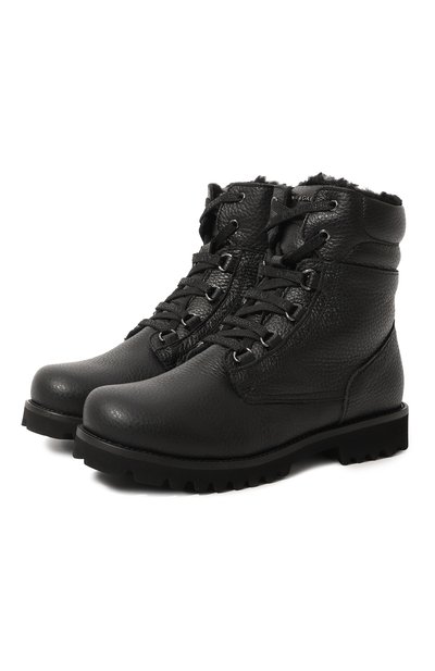 Высокие черные ботинки сшили из прочной зернистой кожи, устойчивой к царапинам. Фактурная внутренняя отделка, стилизованная под стриженую овчину, хорошо сохраняет тепло, а широкая протекторная подошва не пропускает холод от земли и помогает ногам меньше скользить. Чтобы модель со шнуровкой было удобно надевать и снимать, боковую панель дополнили молнией.
