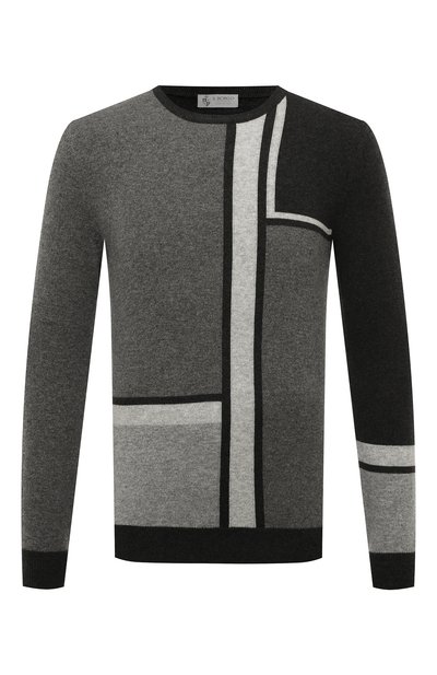 Темно-серый джемпер с крупным геометрическим узором выполнили из мя гкого легкого кашемира, полученного из вычесанного вручную пуха горных коз. Такой материал не только легче и долговечнее обычной шерсти, но и в восемь раз теплее ее, поэтому в вещи с круглым вырезом будет комфортно даже в холодную погоду.