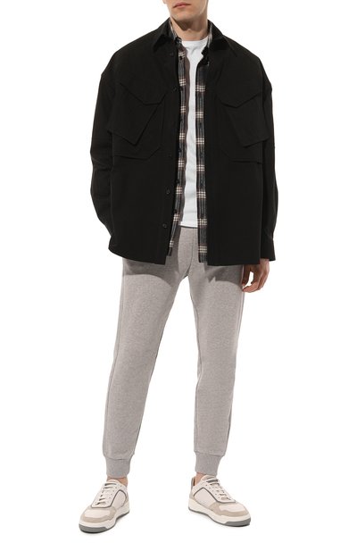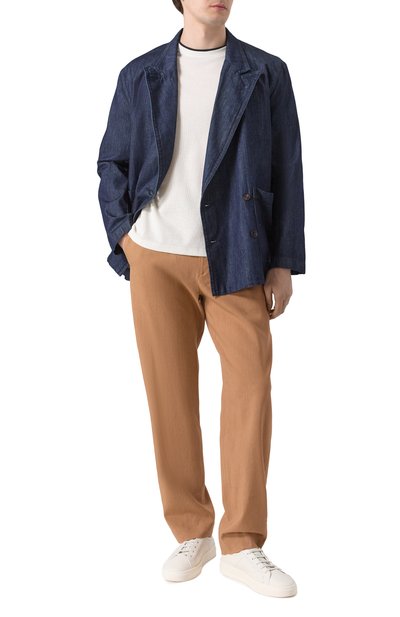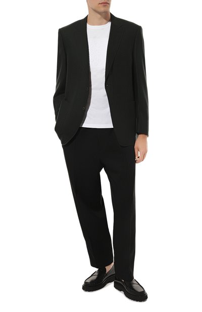 Белую футболку сшили из шелковистого трикотажа на основе волокон модала и хлопка. Смесовое полотно получилось легче и прочнее привычного джерси. Кроме того, оно меньше мнется и быстрее сохнет. Модель украсили миниатюрным металлическим значком в виде символа бренда — орла Royal Eagle, который олицетворяет силу и достоинст во.