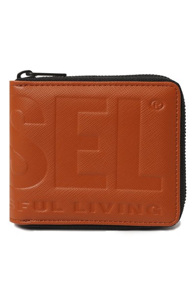 Для пошива портмоне кирпичного оттенка выбрали не совсем характерный материал. Кажется, будто это кожа, но на самом деле изделие сшили из полимера. Материал с фактурным узором не боится царапин и потертостей, делая аксессуар особенно прочным. О принадлежности марке сообщает тиснение в виде логотипа марки. Внутри предусмотрели отделение для купюр, карман на молнии и три слота.