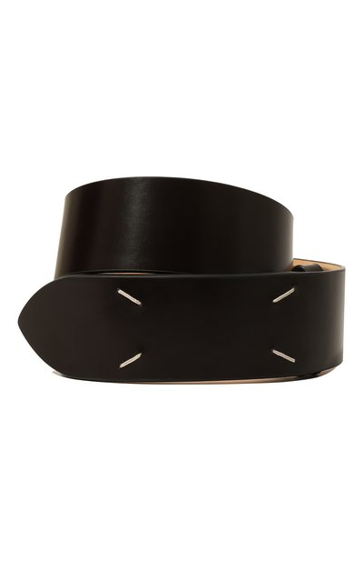 Черный широкий ремень изготовили из гладкой плотной кожи с легким матовым блеском. Конструкцию продумали таким образом, чтобы спрятать пряжку. На ее месте с внешней стороны разместили четыре знаковых для марки стежка контрастного белого цвета.