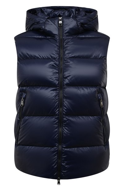 Темно-синий жилет выручит в переменчивую прохладную погоду. Для пошива изделия со встречной молнией и съемным капюшоном мастера марки использовали непродуваемый водоотталкивающий нейлон с легким глянцевым блеском. Стеганую модель утеплили слоем отборного гусиного пуха с добавлением пера.