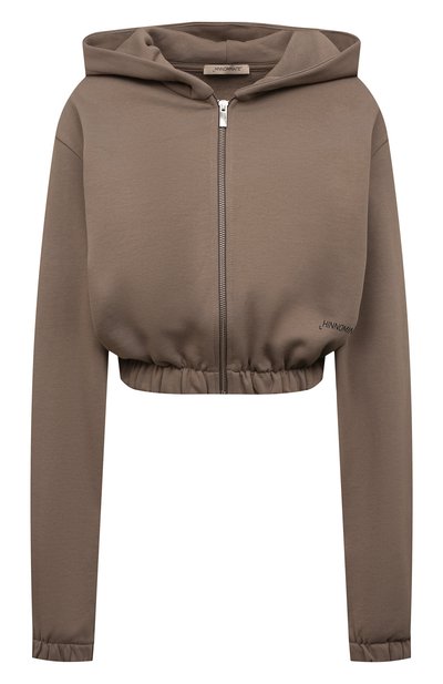 Для пошива толстовки оттенка кофе с молоком команда марки выбрала мягкий хлопковый футер с характерной фактурной изнанкой. Приятный на ощупь материал меньше продувается ветром и лучше, чем джерси, удерживает тепло. Длину модели укоротили, а традиционные рифленые пояс и манжеты заменили эластичными вставками. Изделие с капюшоном застегивается молнией.