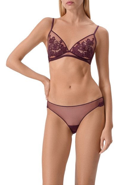 Бюстгальтер с регулируемыми бретелями и поясом с несколькими вариантами объема выполнили из тюля. Мягкие треугольные чашечки украсили цветочной вышивкой.