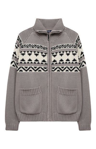 Кардиган связали из мягкой хлопковой пряжи. Одежда из такого материала хорошо пропускает воздух и не перегревает кожу, поэтому в ней будет комфортно и в помещении, и на улице. Черным и белым цветом на серой модели выделили крупный геометрический узор, а накладные карманы, наоборот, сделали в тон. Изделие застегивается молнией.