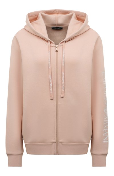 Нежно-розовую толстовку с капюшоном сшили из мягкого хлопкового трикотажа с добавлением прочного легкого полиэстера. Материал с нежной флисовой изнанкой приятно ощущается на теле и хорошо удерживает тепло, поэтому модель сможет заменить легкую куртку в прохладный день. Принадлежность изделия бренду обозначили крупным вертикальным логотипом на левом рукаве.