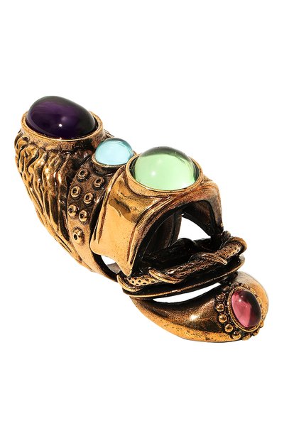 Скульптурное кольцо напоминает сет, составленный из нескольких украшений. Они отличаются полупрозрачными отполированными кристаллами Swarovski разных оттенков и размеров, а также текстурами, искусно выполненными вручную. Чтобы подчеркнуть их, на аксессуар из ювелирного сплава с гальваническим покрытием золотом нанесли чернение.