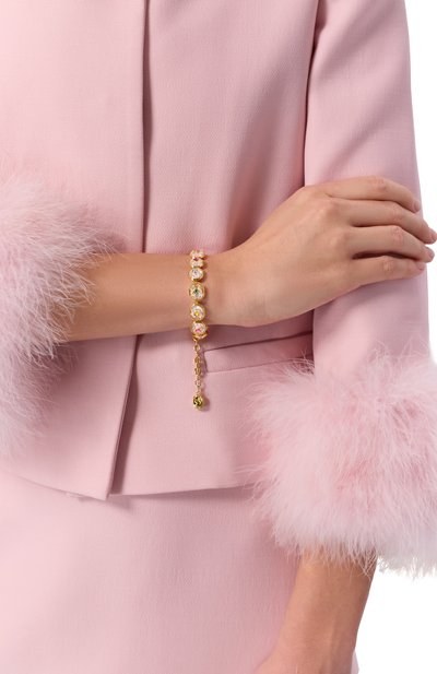 Для изготовления браслета мастера марки использовали легкий ювелирный сплав с гальваническим покрытием золотом. Украшение собрали из сверкающих прозрачных кристаллов в крапановой закрепке. Аксессуар украсили подвеской в форме DG-монограммы, которая рифмуется с центральным элементом.