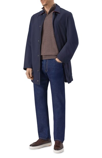Мастера бренда выполнили темно-коричневый джемпер из мягкой тонкой шерсти мериноса, которая по своим качествам не уступает нежному кашемиру. Лаконичная модель с короткой молнией спереди эффективно сохраняет тепло, почти ничего не весит и приятно ощущается на теле. Принадлежность марке подчеркнули небольшим патчем с изображением акулы на левом рукаве.