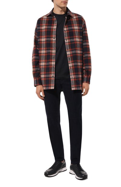 Для изготовления темно-синих кроссовок мастера бренда, основанного Стефано Риччи, использовали мягкую кожу. Плавной форме деталей верха противопоставили белую подошву, форму которой выделили прямыми линиями. Модель декорировали небольшой эмблемой марки, которой вторят люверсы в виде фирменного восьмиугольника.