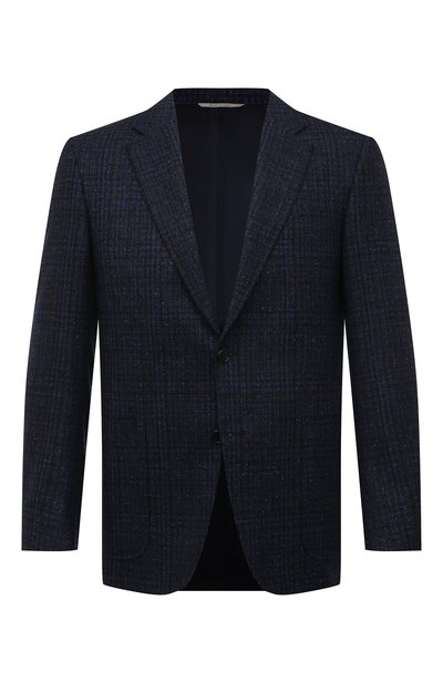 Темно-синий приталенный пиджак с крупными накладными карманами и широкими лацканами выполнен из фактурной шерсти с добавлением невесомого мягкого кашемира и прочного шелка. Армирование придает изделию четкую форму, особая конструкция крепления рукава гарантирует свободу движений, а сложная ручная работа мастеров марки и точная подгонка всех деталей обеспечивают идеальную посадку по фигуре.