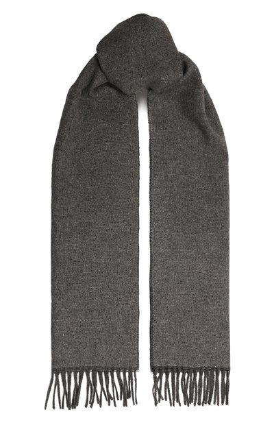 Для изготовления меланжевого шарфа использовали чистый кашемир. Края модели подчеркнули узким кантом и бахромой.
