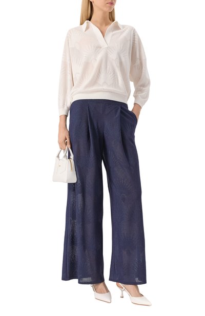 Пуловер с воротником поло и рельефными швами на заниженной линии плеч выполнен из трикотаж а на основе шерсти, вискозы и кашемира. Модель с V-образным вырезом удачно дополнит базовый гардероб.
