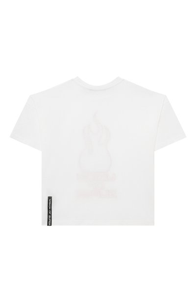 Белую футболку из мягкого гипоаллергенного хлопка украсили крупным принтом в виде Микки Мауса, представленного в образе серфера. Крупный рисунок сочетается с широким кантом, которым дизайнеры бренда подчеркнули круглый вырез и края коротких рукавов.