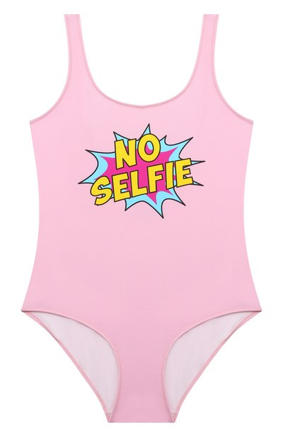 Фирменный логотип на этом слитном купальнике уступил место ироничному слогану «No selfie». Яркий фон надписи имитирует фотовспышку и выделяет принт на нежно-розовом полиамиде. Нити материала соединены с эластаном, поэтому модель с г лубоким вырезом сзади особенно мягко облегает тело.