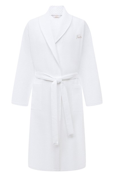 Кипенно-белый халат с поясом-лентой в тон выполнили из отборного хлопка с вафельной фактурой. Рельефные ячейки помогают лаконичному изделию впитывать влагу не хуже махровых моделей и одновременно делают его более легким. Ритм трехмерного рисунка нарушает лишь кремовый логотип марки, вышитый слева на груди.