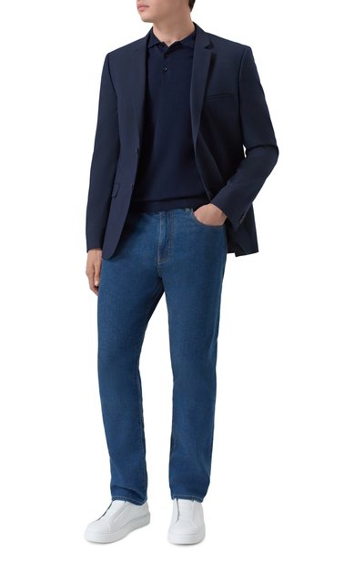 Темно-синий пиджак с прямоугольными лацканами и четко очерченной линией плеч сшили из тонкой прочной шерсти. Этот материал, тщательно выверенные лекала и точная подгонка деталей, предварительно обработанных паром, делают модель комфортной. Она садится точно по фигуре и не сковывает движения. Края изделия прошили дек оративной строчкой пунто.