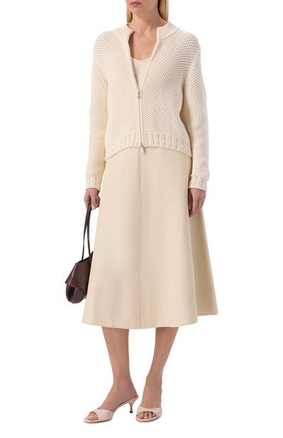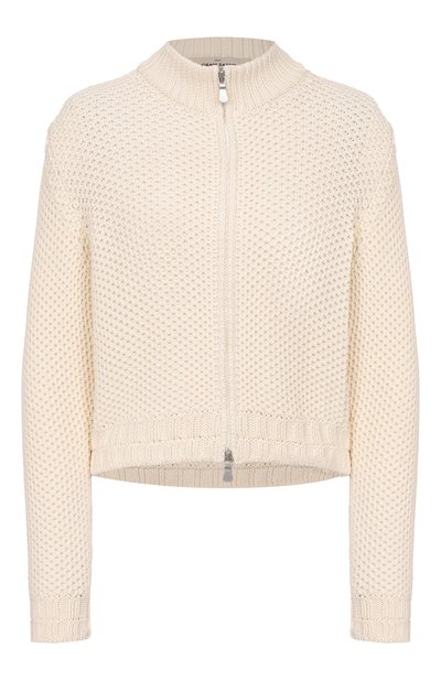 Представленный эксклюзивно в ЦУМе кардиган с рукавами реглан связали в технике английской резинки из мериносовой шерсти. Высокую горловину можно расстегнуть и превратить в широкий отложной воротник.