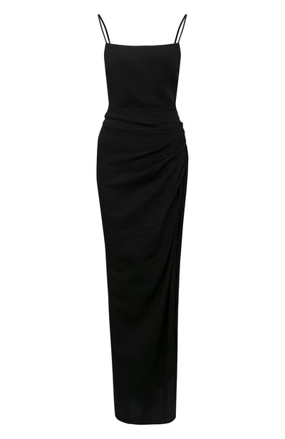 Узкие бретели черного вечернего платья оставляют почти обнаженными не только плечи, но и спину. Градус провокации повышает боковой разрез, который высоко открывает левую ногу при каждом шаге. Деталь, достойную красной ковровой дорожки, обрамляют крупные мягкие складки на струящейся вискозе со слегка жатой фактурой.