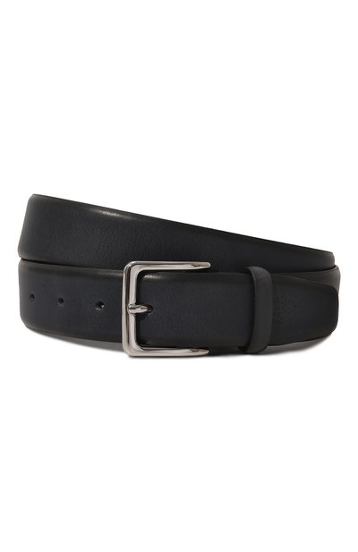 Темно-синий ремень с квадратной серебристой пряжкой выполнили из плотной зернистой кожи. Фактуру акцентировали, отполировав материал до легкого блеска, а края изделия подчеркнули патиной, которая создает вид аксессуара с историей. Модель украсили миниатюрной брендированной пластиной и тисненым логотипом марки.