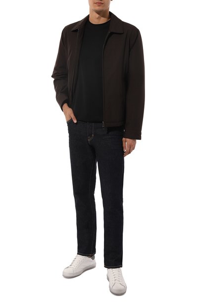Черная футболка получилась предельно лаконичной: единственный декор — вышитый логотип марки, который делают заметным только рельеф и блеск шелковой нити. Такая модель из мягкого, дышащего хлопкового джерси органично будет смотреться в повседневном образе с джинсами или снизит формальность офисного костю ма.