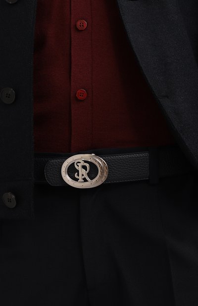 Ремень универсального темно-синего цвета выполнили из крупнозернистой матовой кожи. На такой меньше, чем на гладкой, заметны царапины и потертости, поэтому аксессуар надолго сохранит новый вид. Модель застегивается овальной кобурной пряжкой с рельефной эмблемой бренда.