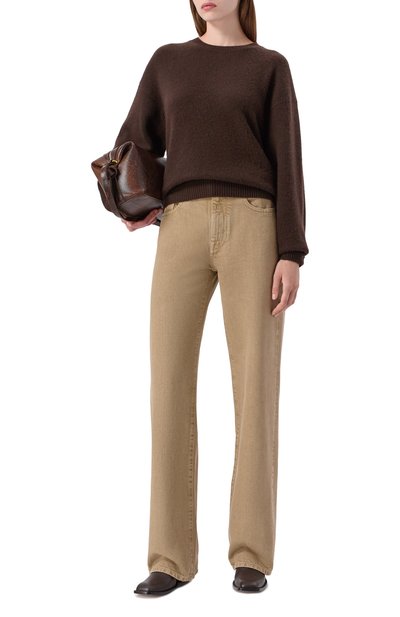 Oversize-худи выполнили из кашемировой пряжи лицевой вязкой, а манжеты и пояс – мелкой резинкой. Модель составит гармоничный комплект с парными джоггерами.