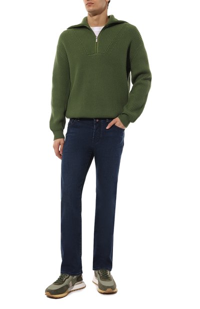 Прямые темно-синие джинсы сшили из прочного хлопка kurabo с добавлением тонких эластановых нитей. После обработки в готовом виде модель приобрела слегка неоднородный оттенок, который со временем станет выразительнее. В комплекте — разноцветный платок для полировки фурнитуры, покрытой слоем серебра.