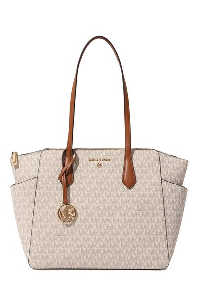 Для пошива сумки Marilyn использовали фирменную плотную канву с бежево-кремовым орнаментом, составленным из инициалов Майкла Корса. Прорезиненный прочный текстиль не промокает, легко очищается от загрязнений и хорошо держит форму, поэтому внутри не помнутся бумаги формата А4. В основное отделение также поместятся зонт и кошелек, в два внешних накладных кармана по бокам — смартфон, AirPods и ключи.