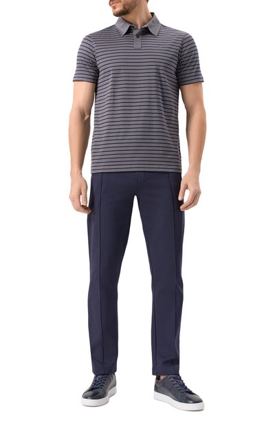 В черно-белом поло соединили черты классической модели и джемпера, позаимствовав у второго как характерные манжеты, так и материал. Для изготовления модели в узкую полоску использовали приятный на ощупь хлопковый трикотаж. Его выполнили эластичной вязкой из ультрадлинных волокон премиального качества, поэтому изделие немного тянется и комфортно садится по фигуре.
