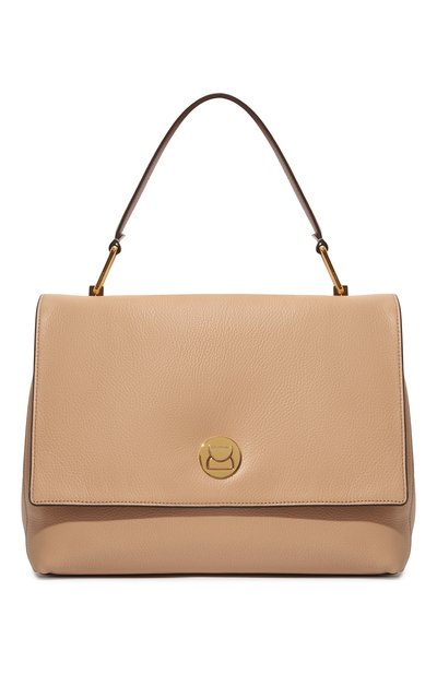 Бежевый оттенок и полное отсутствие декора помогут сумке Liya с короткой ручкой прописаться и в повседневном, и в более строгом офисном образе. Модель сшили из мягкой зерненой кожи растительного дубления. В основное отделение, закрывающееся клапаном на фирменный замок, поместятся бумаги формата А4, планшет, кошелек, бутылка воды, зонт и смартфон. В комплекте — регулируемый плечевой ремень.